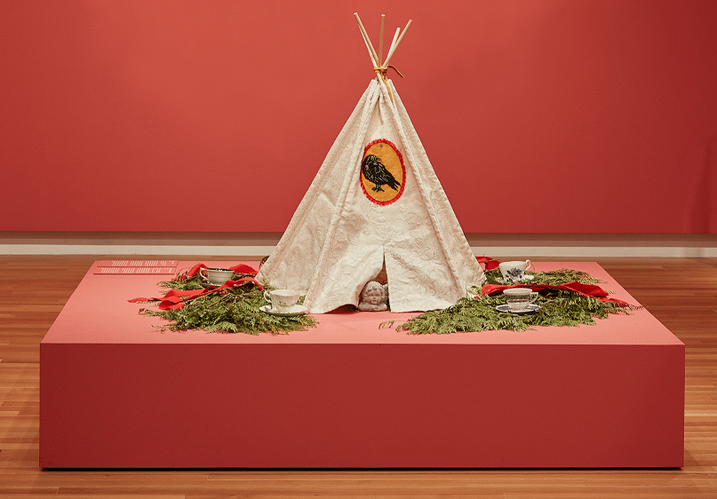 MEDIUM Deer hide, beads, lace, wooden dowels, teacups