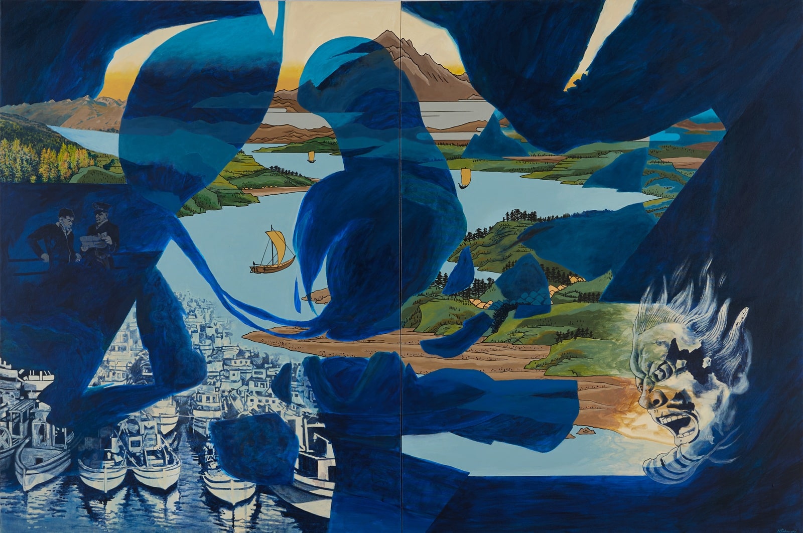 CATALOGUE DESCRIPTION A Collage style, painted in blue of boats in the lower Left corner and two people looking at a document above and a figures face on the right lower corner. Parts of the painting in colour show a landscape that is inspired by japanese woodcut design.